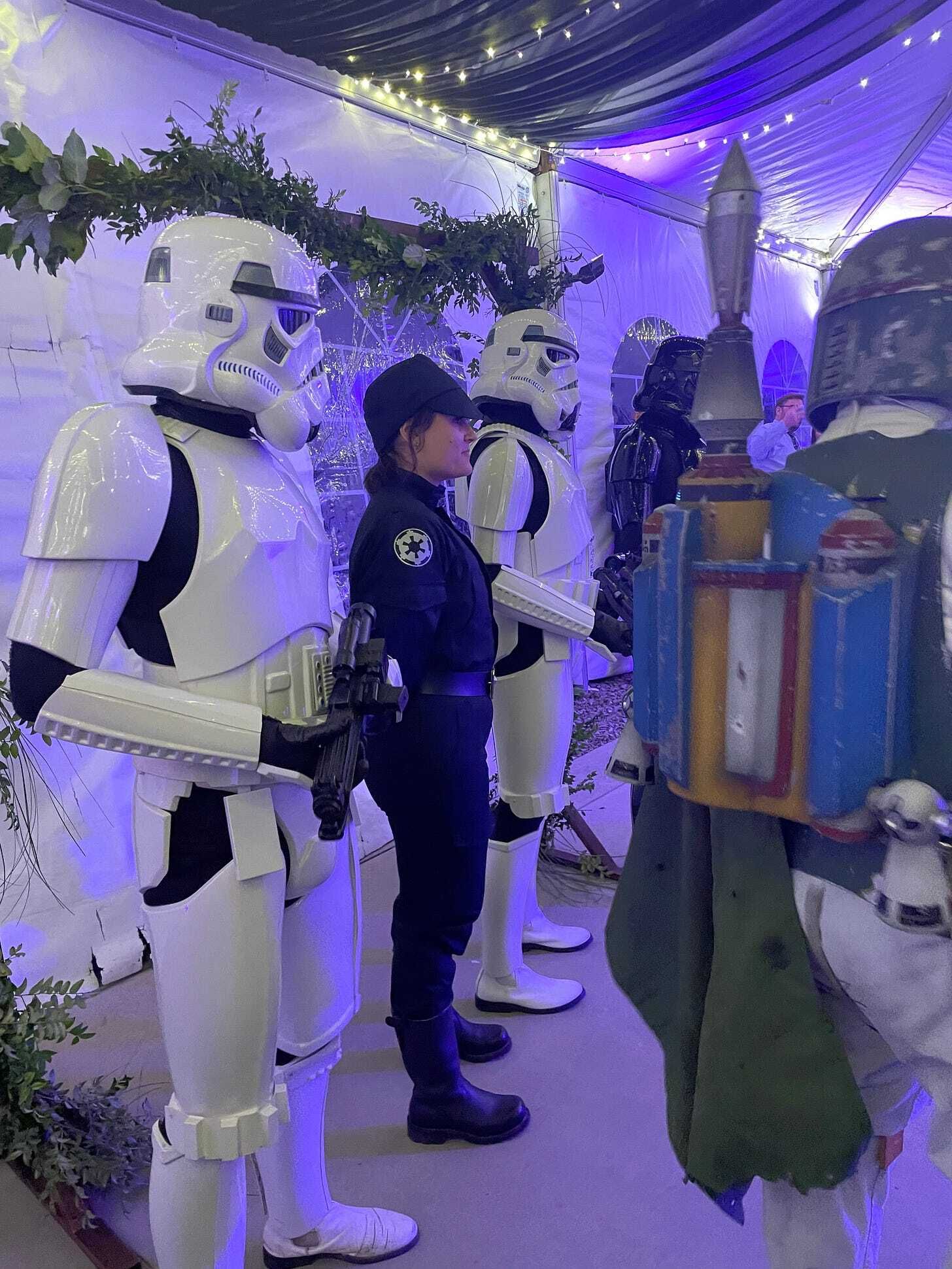 And best of all…after dinner, some Stormtroopers joined the party! They were the 501st CT Garrison, a wonderful group that makes group appearances at various events in full, movie-accurate costumes to raise money for the Make-a-Wish Foundation and other charitable causes. (Chris and Tess regularly go to the Denver group’s annual auction, and the Denver group was kind enough to put them in touch with the CT locals.) They leaned all the way in, taking photos with everyone who wanted to and also joining the dance floor for some good times.