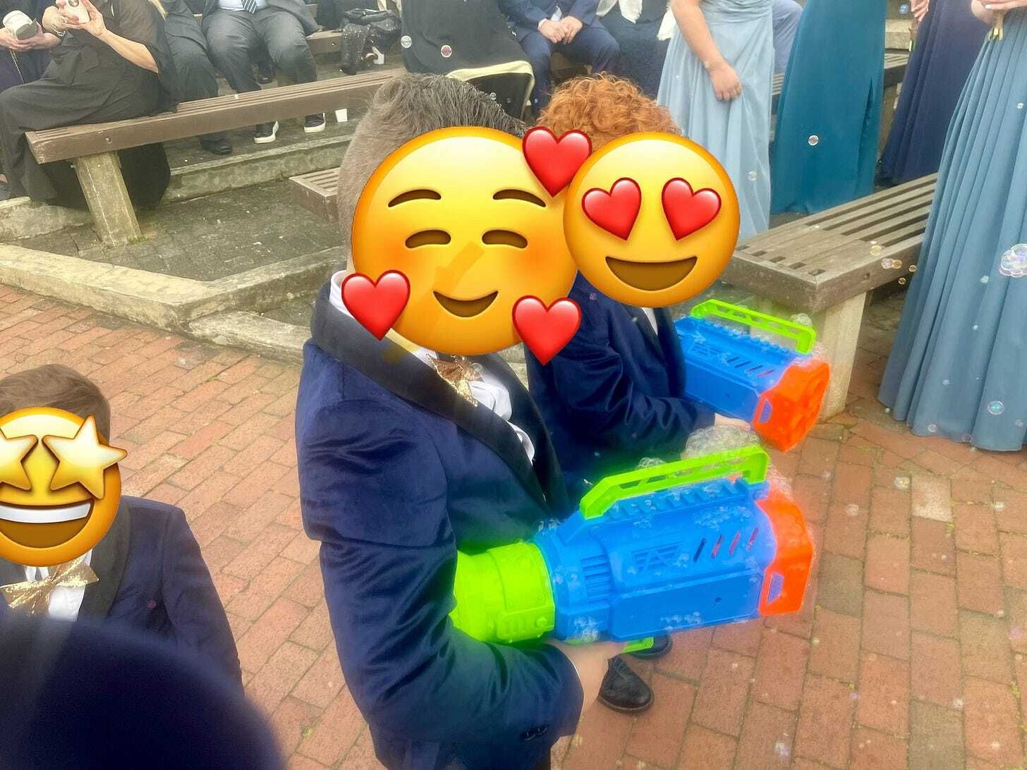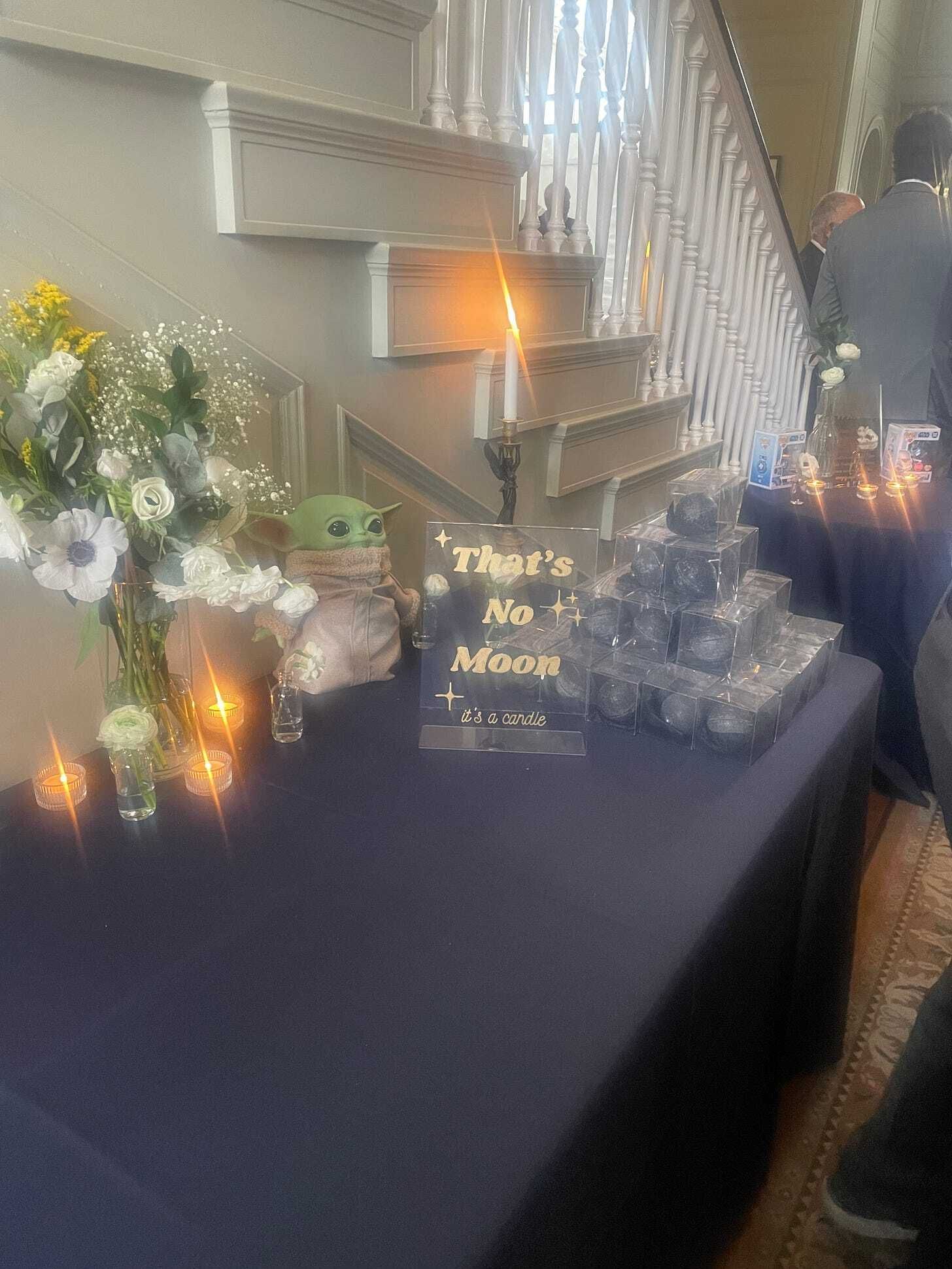 Then, party time! As befits a Star Wars Day celebration, there were plenty of references - the party favors were Death Star-shaped candles, the bride tossed a stuffed Baby Yoda instead of the traditional bouquet (and aimed it at the bubble gun-wielding kiddos, to their delight), and the specialty cocktails were an Aperol Sith and a Tatooine Sunset made to look like Baby Yoda with double limes on the glass. (I tried my best to capture it, but when I did it was my second reception drink, plus the scotch and beer before, so…)